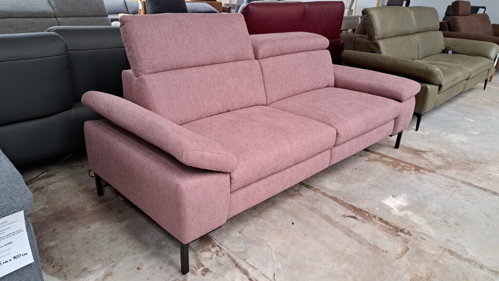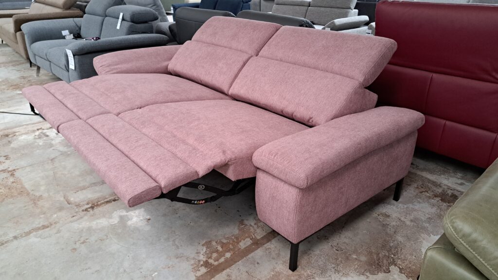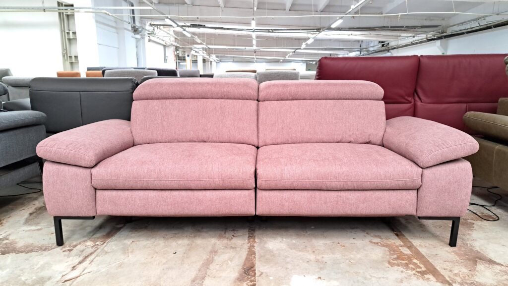 Sofa posiada regulowane zagłówki, podłokietniki oraz dwa siedziska z elektrycznie rozkładaną funkcją relaks.